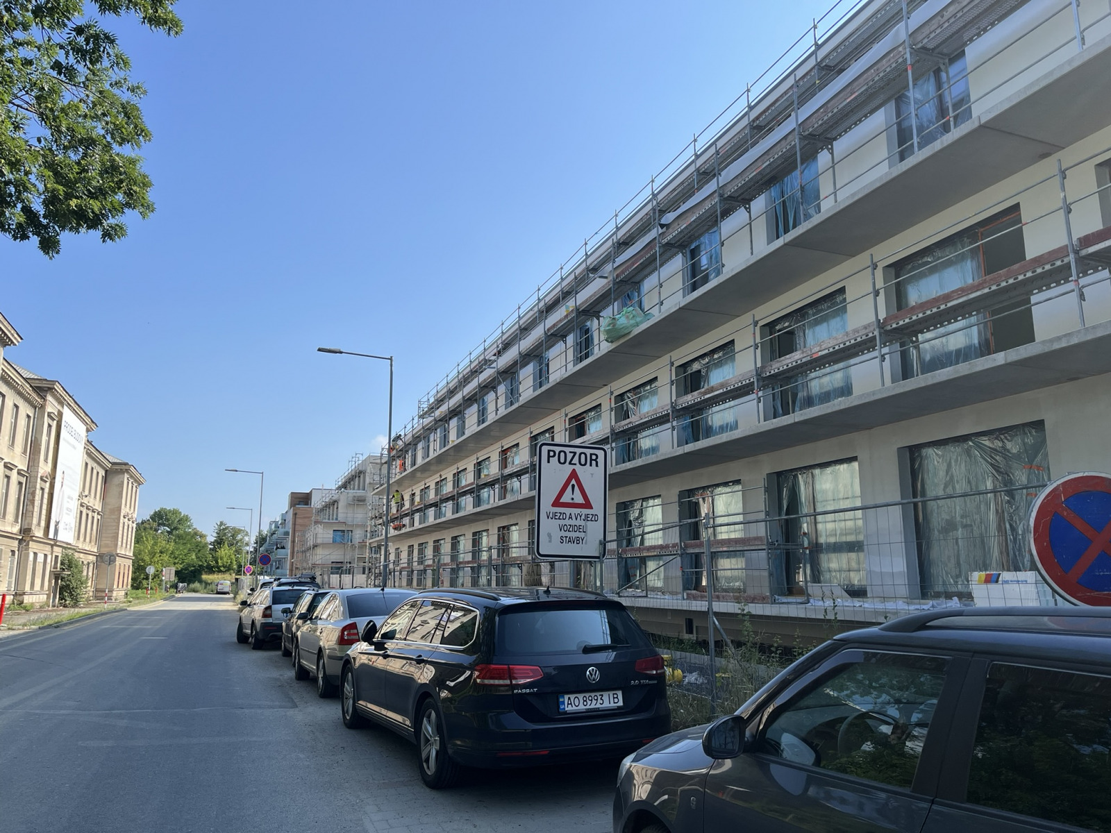 Mezi domy vzniká komunikace, chodníky a parkovací stání.