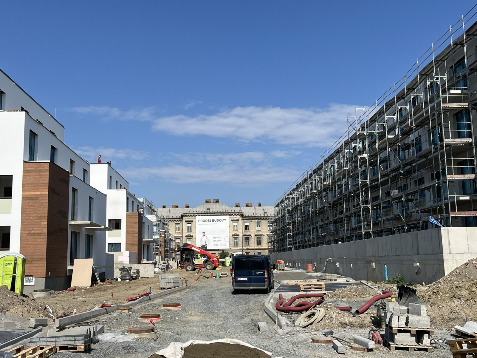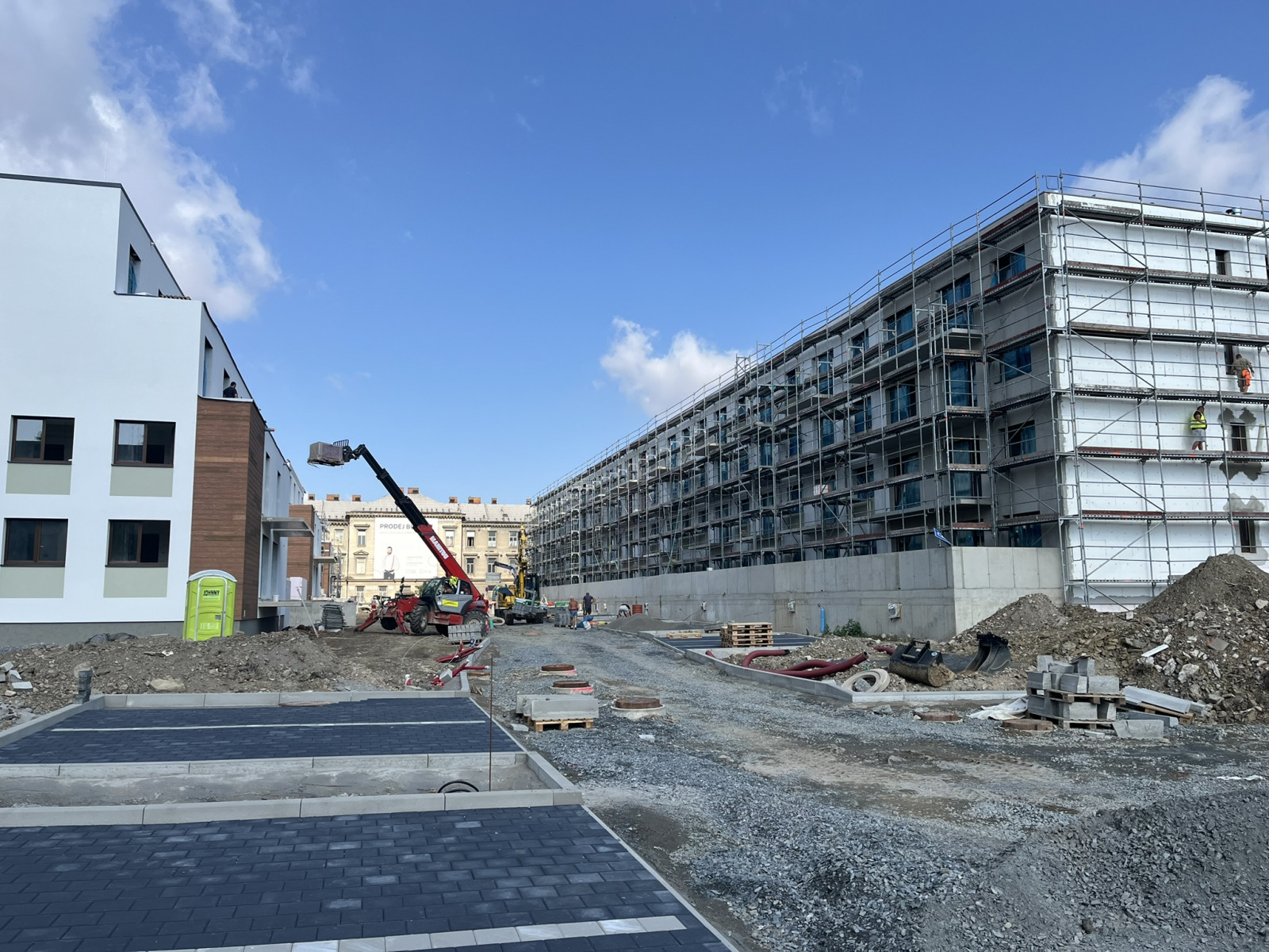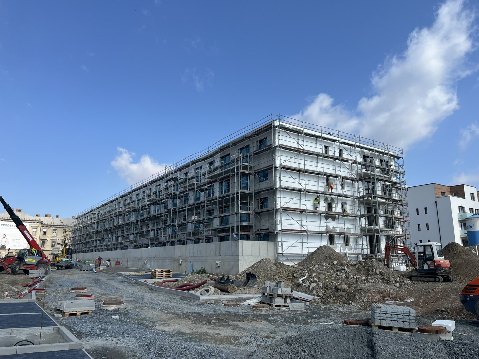 V budově B dokončujeme omítky, SDK příčky a podhledy a přípravu koupelen pro obklad. Začínáme s pokládkou dlažby.